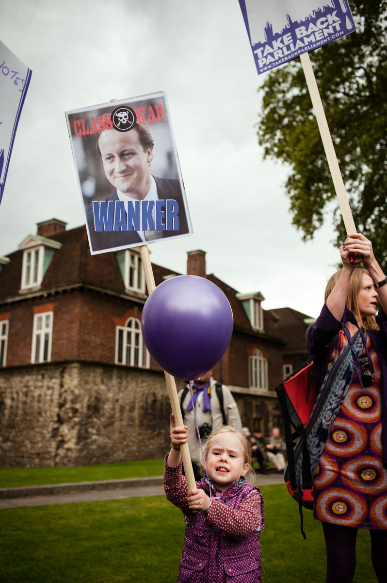A young girl protests during the 2010 Take Back Parliament protest in London.